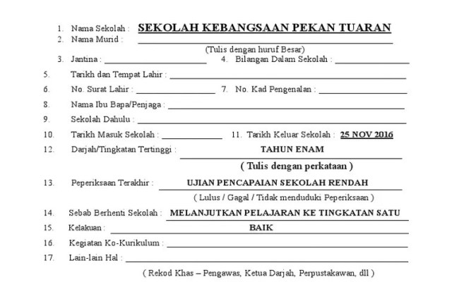 Sijil berhenti sekolah saya hilang. Contoh sijil tamat tadika pdf. Semua sedia maklum yang tugas sebagai seorang guru bukan hanya terhad kepada mengajar . Surat akuan sijil berhenti sekolah. Untuk pengetahuan kalian, sijil berhenti sekolah perlu dirujuk ke sekolah terakhir tempat anda bersekolah. Sijil berhenti sekolah sijil upsr pt3 . Tanya pihak sekolah, tiada rekod & semua guru yg zamannya dulu semua sudah tiada. Contoh surat berhenti notis sebulan contoh surat perletakan jawatan notis sebulan. Orang kata ada dua cara nak dapatkan balik salinan sijil spm yang hilang. Tapi yang menjadi masalahnya sijil berhenti sekolah hilang la pulak. Jadi macam mana nk buat ea? Apabila sijil hilang di antara pusat dan calon cambridge english akan mengeluarkan salinan pendua dengan. Ada pernah berlaku seperti saya tak?dan bagaimana cara nak ganti sijil. Surat ini terdiri dari identitas pemilik sebuah pernyataan kehilangan . 19 contoh surat mohon sijil berhenti sekolah.